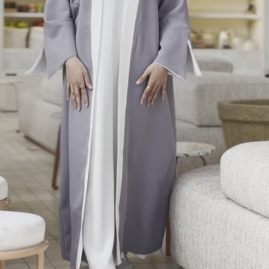 Celebrate Ramadan in style with our Rosaline Kaftan! Featuring a classic gray and off-white design, this kaftan combines simplicity and elegance. Perfect for any occasion.
